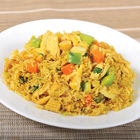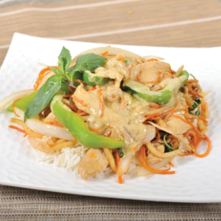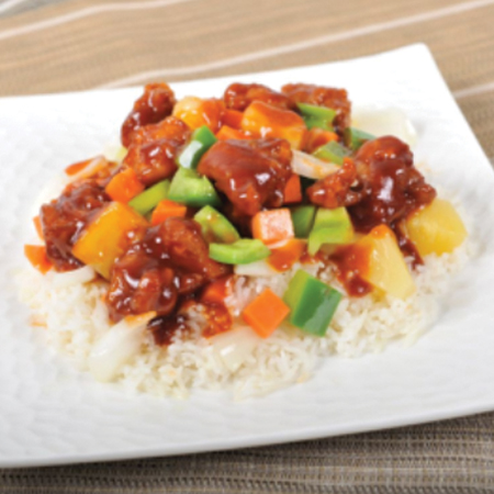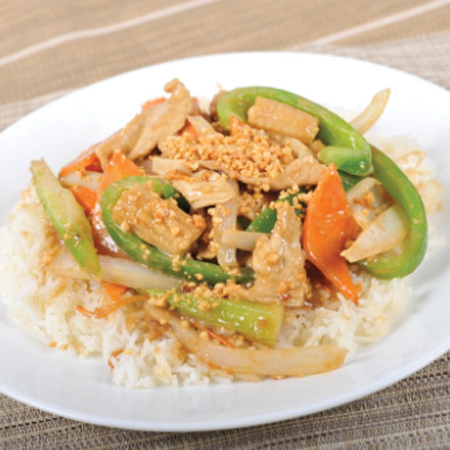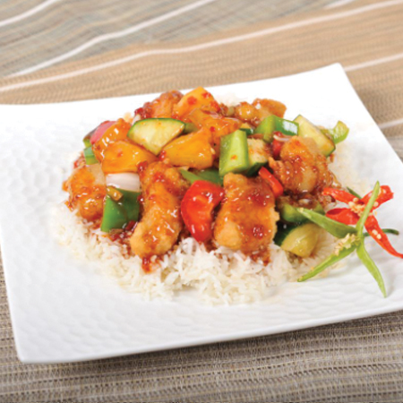 Stir-fried peppers, cucumbers, onions, and pineapple in Simply Thai's homemade sweet chilli sauce on steamed rice.